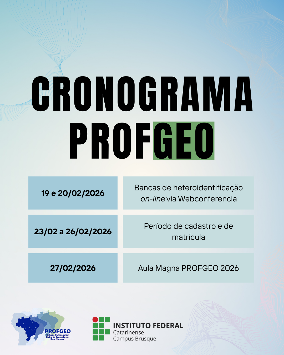 – Período de cadastro e matrícula, por meio do e-mail secretaria.profgeo@ifc.edu.br;
