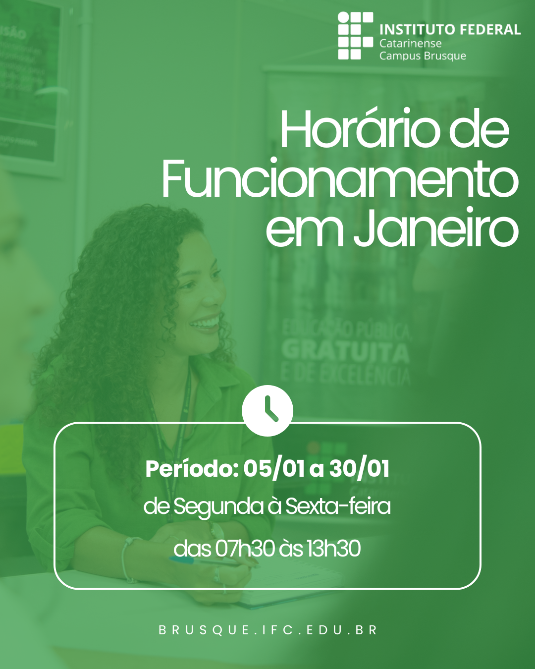 Em razão do recesso escolar e da redução significativa da demanda por atendimentos administrativos e acadêmicos, informamos que o IFC Câmpus Brusque funcionará em horário reduzido, visando garantir economicidade, eficiência administrativa e a otimização dos recursos institucionais.