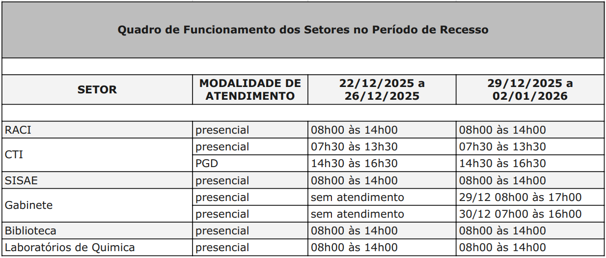 A instituição divulgou o quadro oficial de funcionamento dos setores administrativos e acadêmicos durante o período de recesso, compreendido entre os dias: