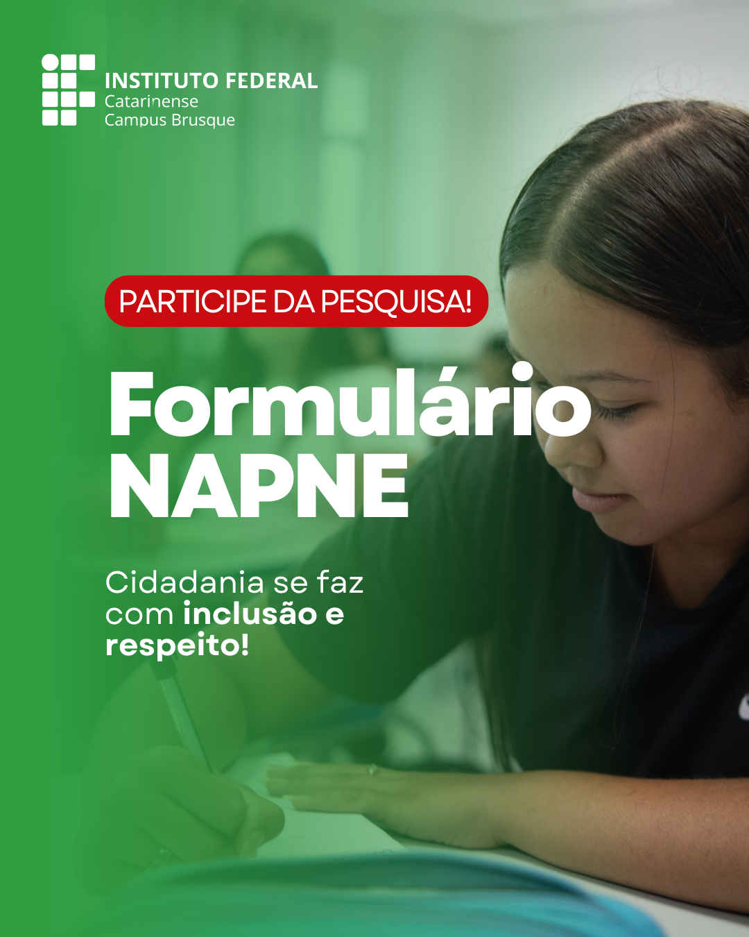 Com a finalidade de analisar a situação atual do Núcleo de Acessibilidade às Pessoas com Necessidades Específicas – NAPNE no Campus Brusque, estamos promovendo um diagnóstico Institucional que permitirá identificar pontos fortes, desafios e possibilidades de aprimoramento, subsidiando a construção de um plano de ação mais eficiente e alinhado às demandas da comunidade.