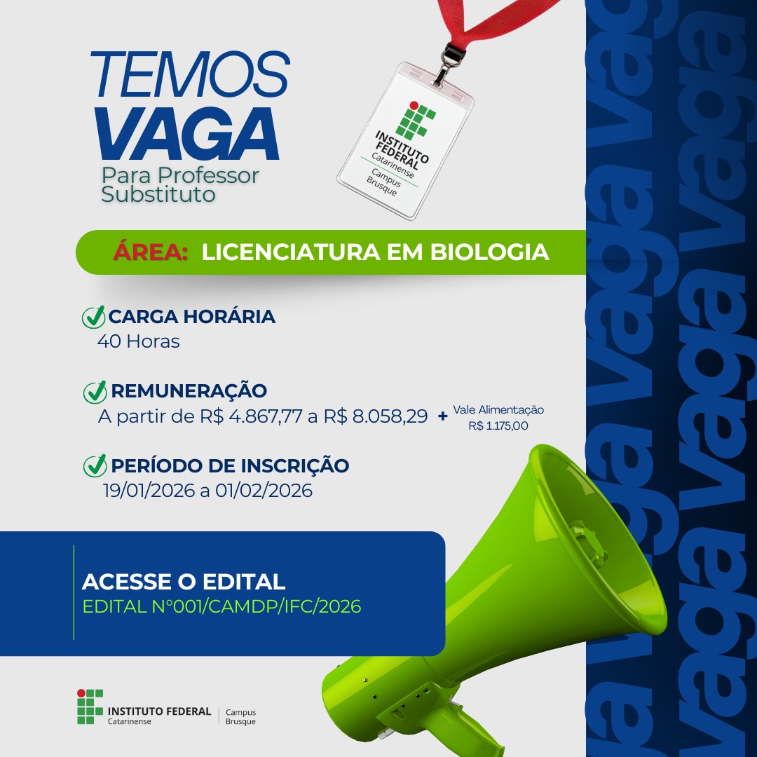 O Instituto Federal Catarinense – Campus Brusque anuncia a abertura de inscrições para o processo seletivo destinado à contratação de Professor Substituto de Biologia.