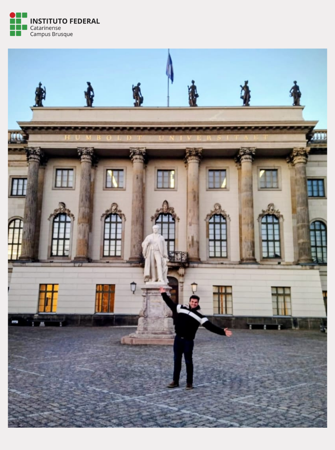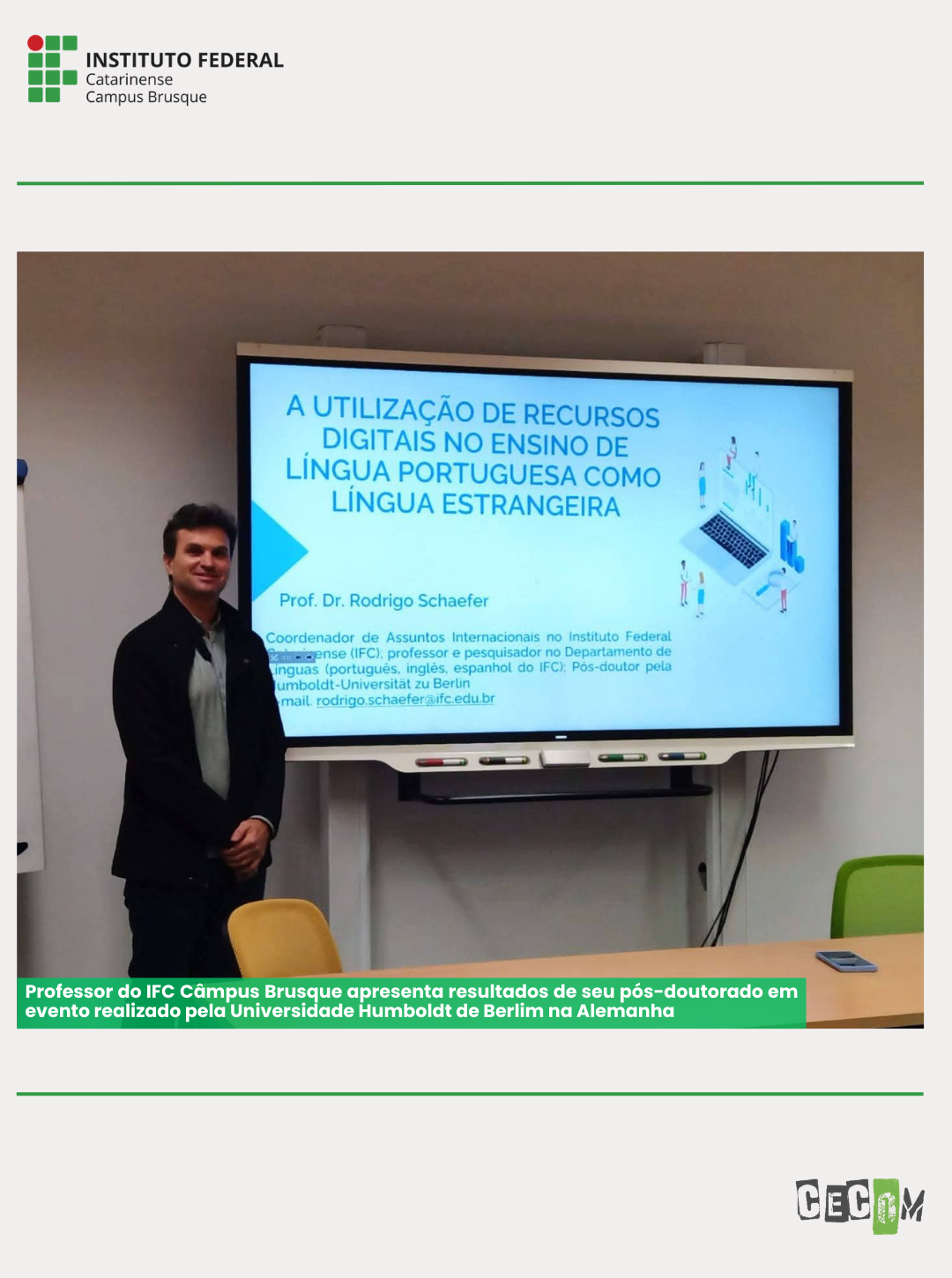 Em janeiro de 2026, o professor Rodrigo Schaefer, do Instituto Federal Catarinense Câmpus Brusque, teve a oportunidade de apresentar os resultados de seu pós-doutorado, realizado em 2024, na Humboldt-Universität zu Berlin (Universidade Humboldt de Berlim, Alemanha). No evento, o docente abordou aspectos relacionados à sua pesquisa com professores e estudantes da instituição alemã mencionada.